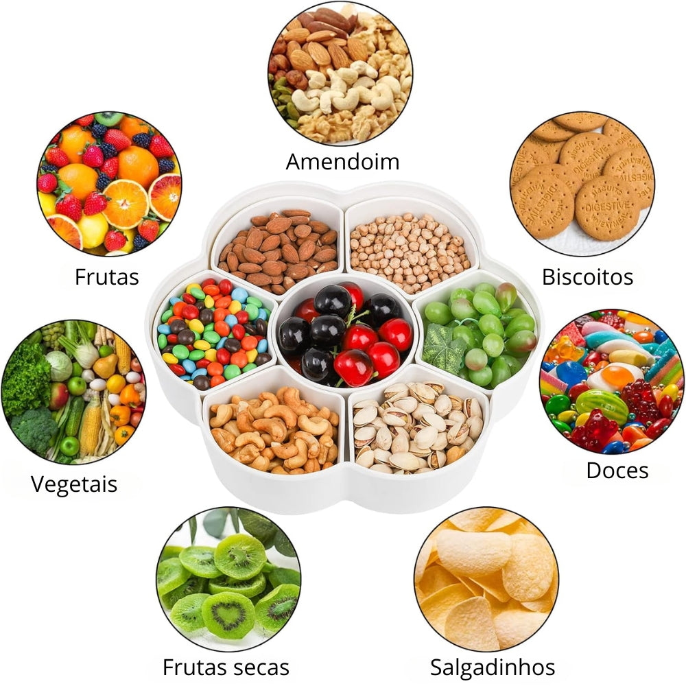 Com 7 compartimentos espaçosos, você pode separar diferentes alimentos sem misturar sabores: nozes, castanhas, frutas, chocolates, biscoitos, salgadinhos, molhos e muito mais.