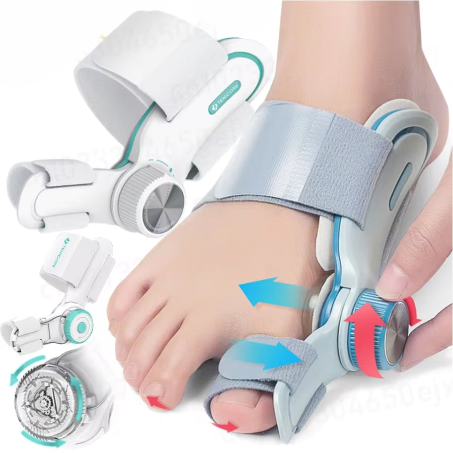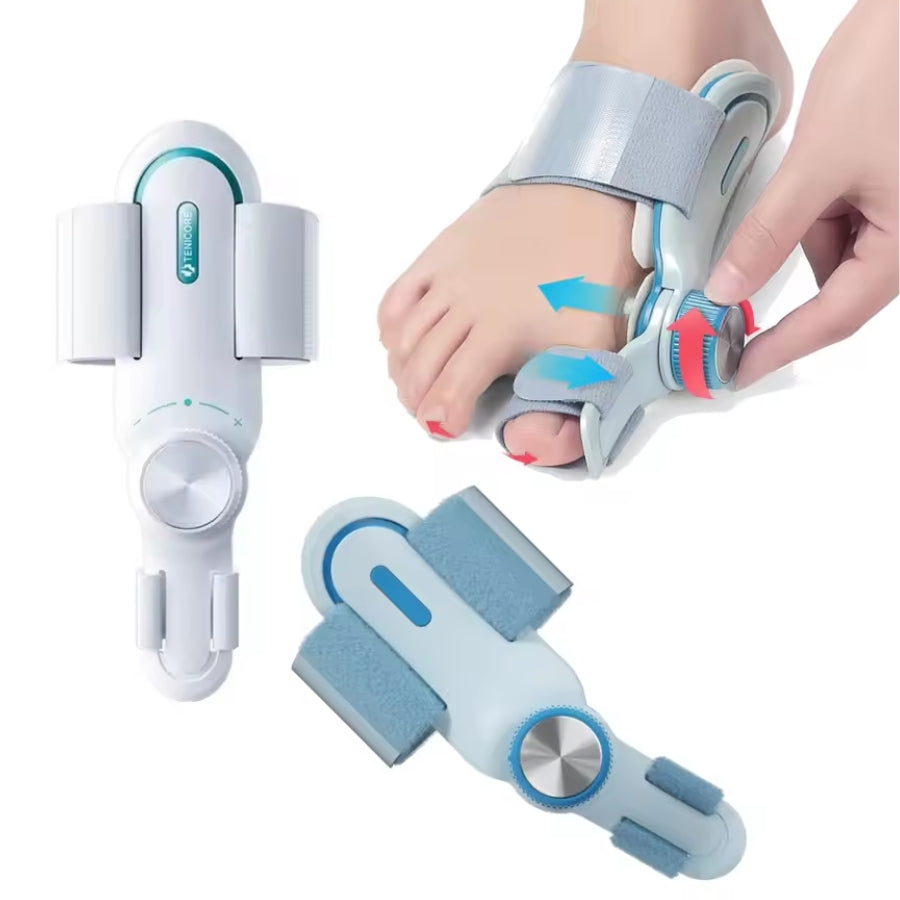 Protetor articulado para correção de joanete que protege o dedão contra torções. A articulação permite movimentos mais livres e a prática de esportes.