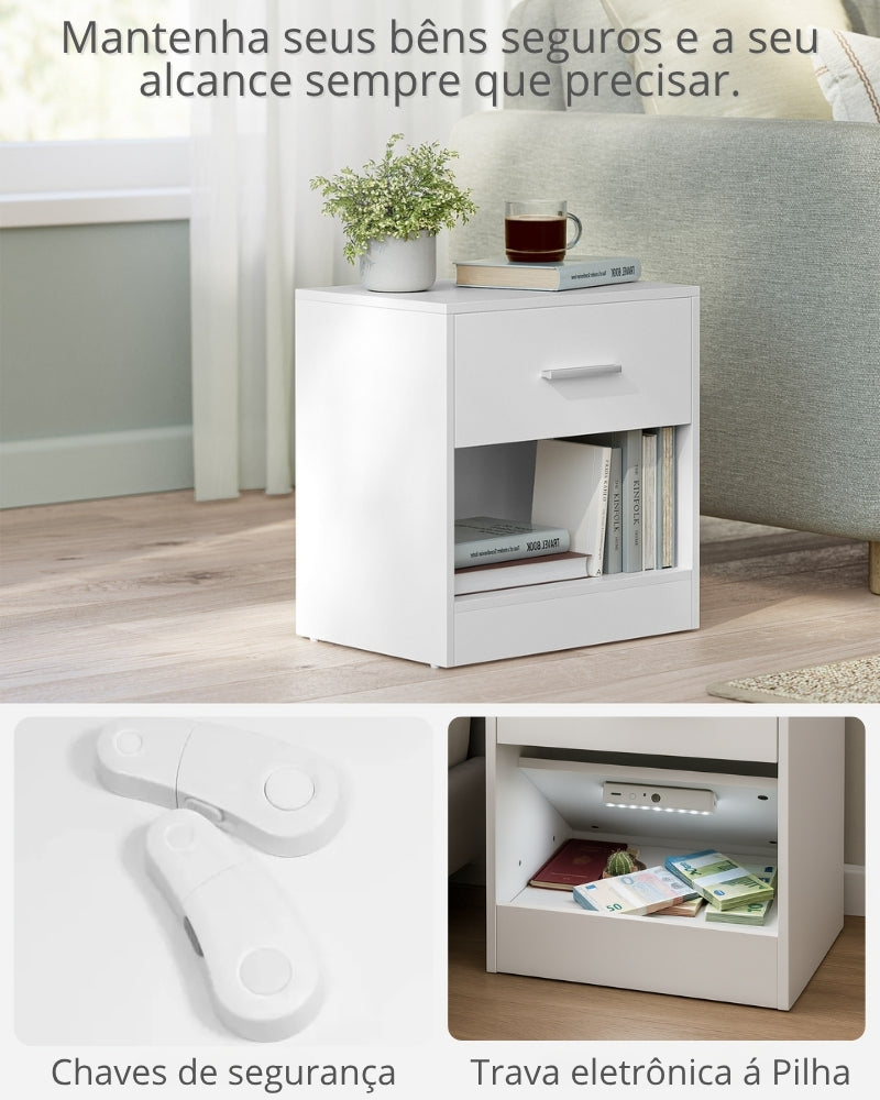 om trava eletrônica ativada por chave magnética, iluminação interna em LED branco suave, e acabamento premium em MDF de alta densidade, esta mesa transforma o simples ato de guardar algo em uma experiência de confiança e sofisticação.