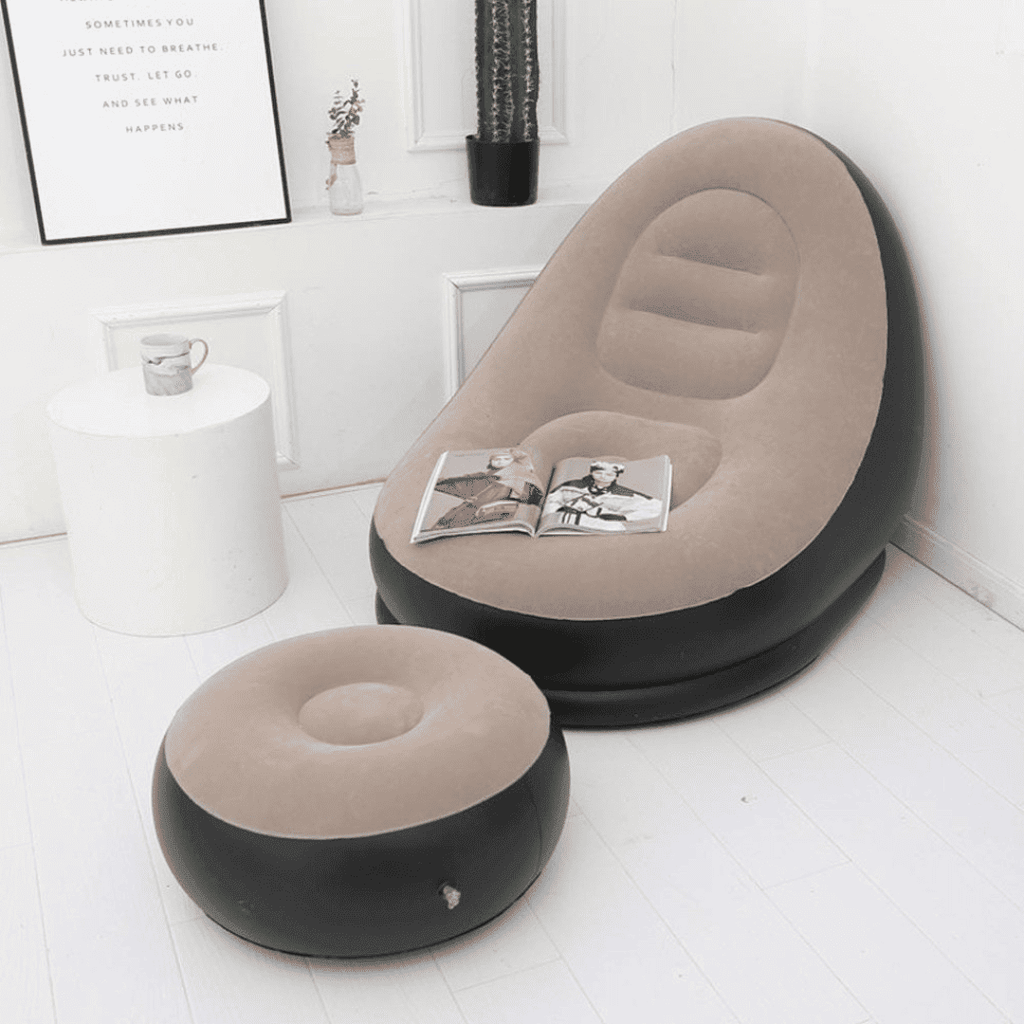Relaxe com Estilo e Conforto em Qualquer Lugar! Transforme seus momentos de descanso com a Poltrona e Puff Inflável Descanso Preguiçoso, a combinação perfeita de praticidade e design moderno.