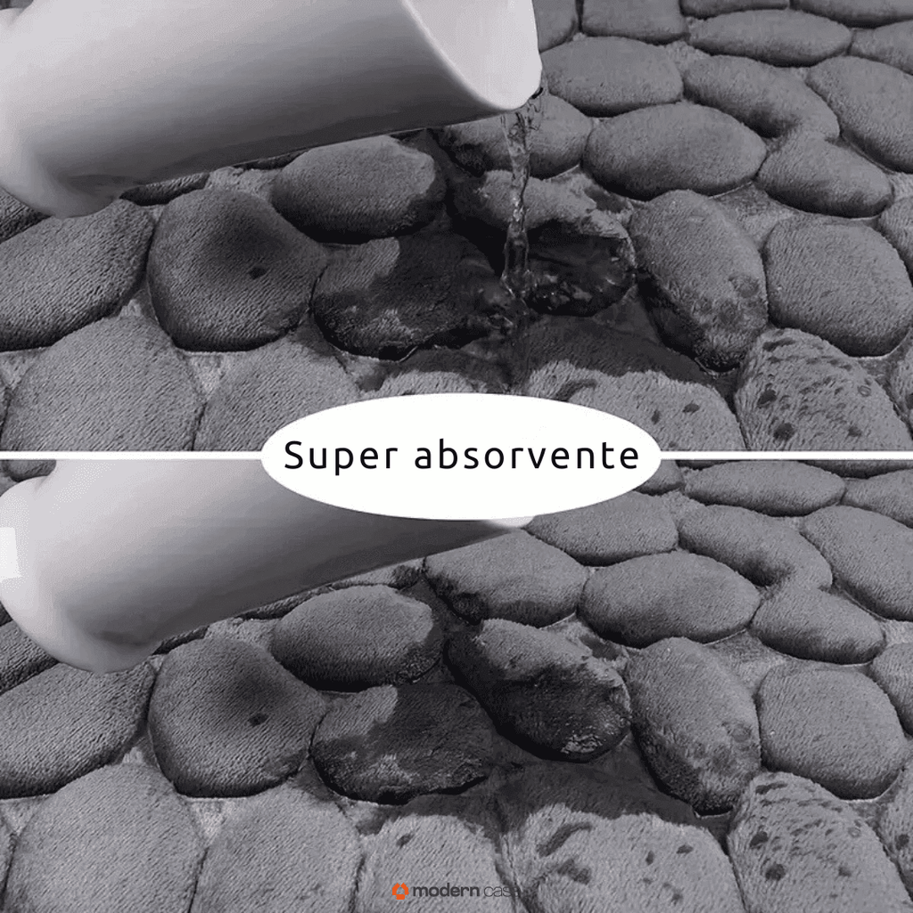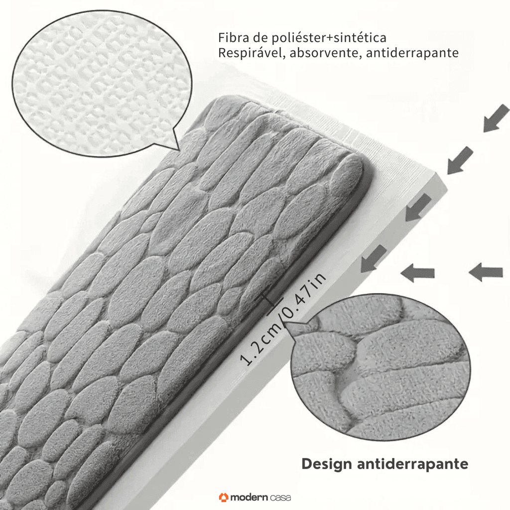 - Revestimento: Sua estrutura absorve a água ao sair do banho e possui fibras que permitem a secagem rápida do tapete